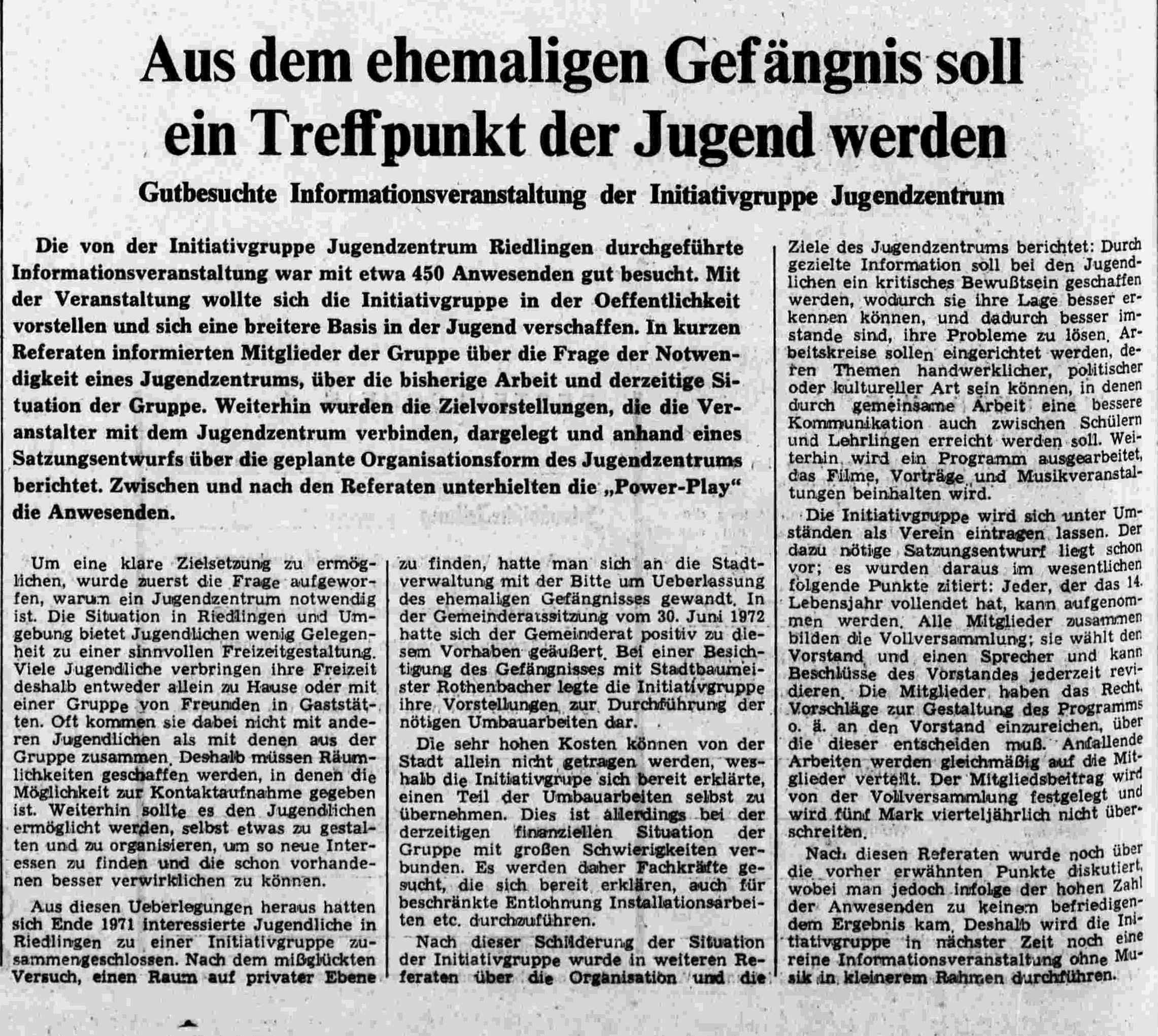 Die von der Initiativgruppe Jugendzentrum Riedlingen durchgeführte Informationsveranstaltung war mit etwa 450 Anwesenden gut besucht. Mit der Veranstaltung wollte sich die Initiativgruppe in der Oeffentlichkeit vorstellen und sich eine breitere Basis in der Jugend verschaffen. In kurzen Referaten informierten Mitglieder der Gruppe über die Frage der Notwendigkeit eines Jugendzentrums, über die bisherige Arbeit und derzeitige Situation der Gruppe. Weiterhin wurden die Zielvorstellungen, die die Veranstalter mit dem Jugendzentrum verbinden, dargelegt und anhand eines Satzungsentwurfs über die geplante Organisationsform des Jugendzentrums berichtet. Zwischen und nach den Referaten unterhielten die „Power-Play“ die Anwesenden.